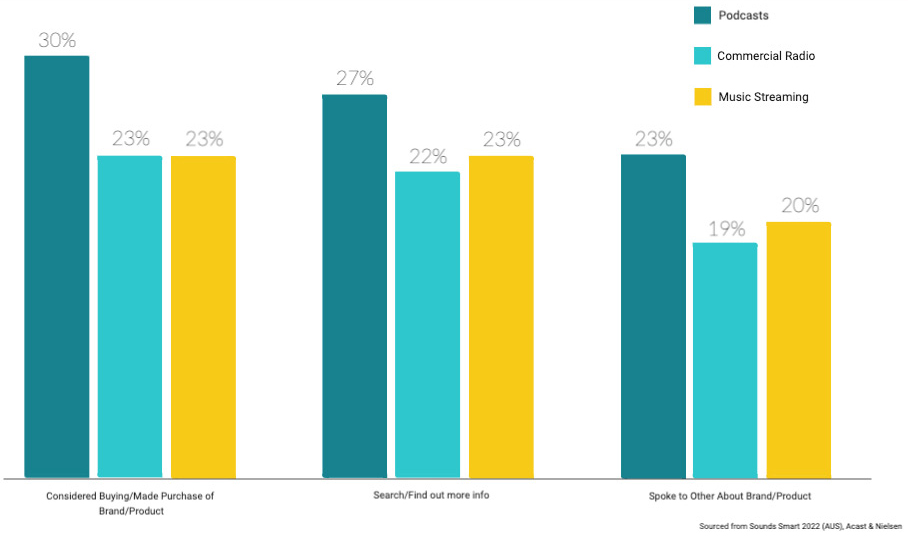 The reason for this is the benefits of having audio that engages its audience and plays on the emotions of the listener (when attentive) is almost unmatched. Acast recent Sounds Smart 2022 (AUS), Acast & Nielsen report shows how important attention during podcasts is to direct brand actions.
